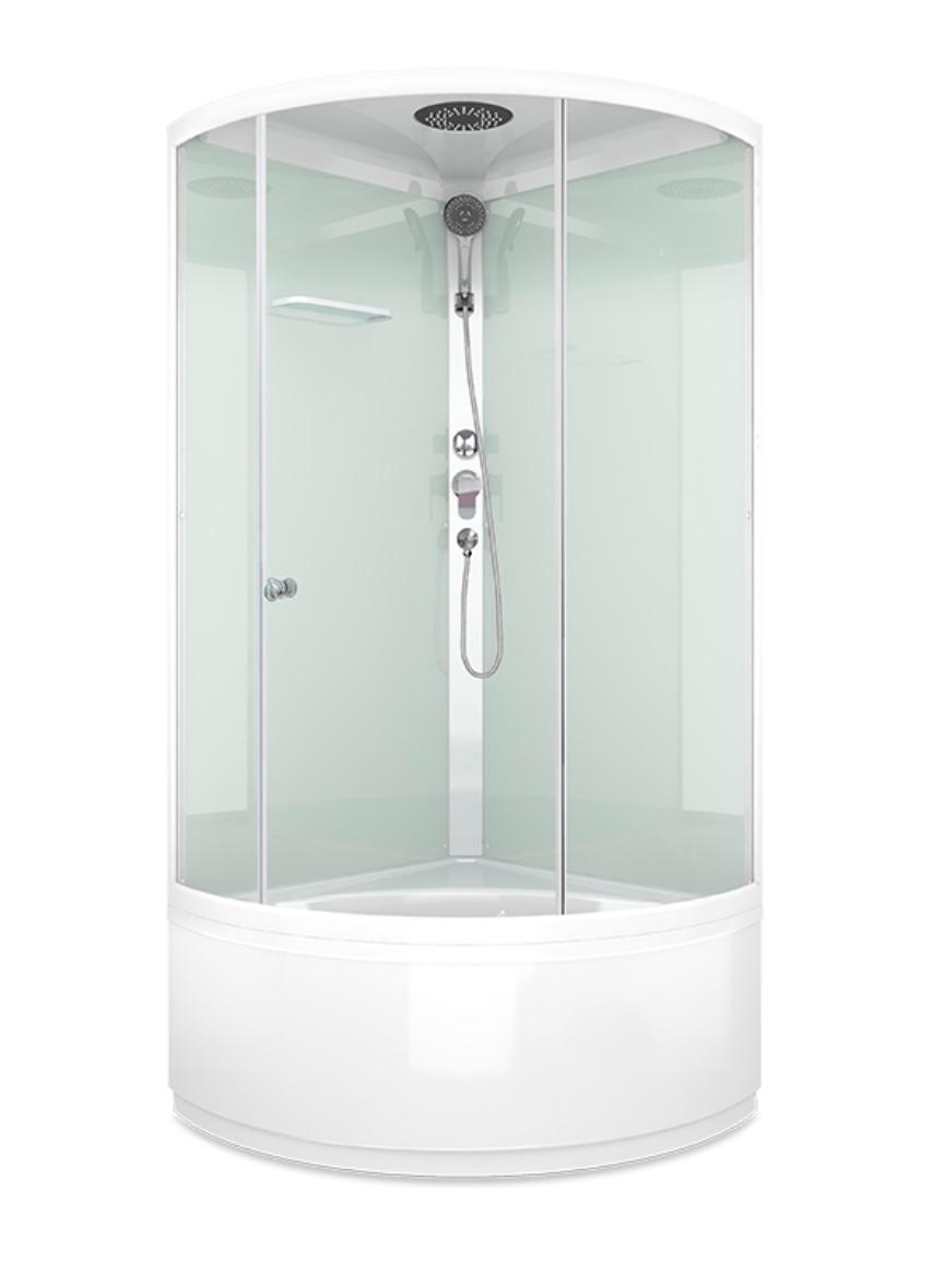 Угловая душевая кабина со стекляными прозрачными дверцами и белыми стенками и профилем. Низкий поддон. Открытие и закрытие двери одной рукой. В комплекте смеситель, верхний душ и ручной душ на гибком шланге. Полочка для ванных принадлежностей. Душевая кабина укомплектована сливными кнопками с системой забора волос и другого мусора, что позволяет сократить денежные расходы, связанные с чисткой или заменой канализации. Поддон усилен сплошной плитой ДСП 16 мм. Поддон, стенки и крыша изготовлены из прочного санитарного акрила. Завод находится в России и разработал уникальную конструкцию профиля, благодаря которой, горизонтальный профиль ложится не рядом с бортиком, а на бортик, и не имеет движения по поддону, что обеспечивает жесткость конструкции, а отсутствие зазора между профилем и бортом препятствует скоплению трудноизвлекаемой грязи. Формы деталей для душевых кабин изготавливаются на станках ЧПУ, что дает деталям стыковаться друг с другом без малейших зазоров.