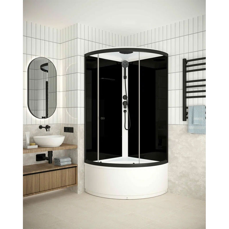 Угловая душевая кабина со стекляными тонированными дверцами, черными стенками и белым профилем. Высокий поддон. Открытие и закрытие двери одной рукой. В комплекте смеситель, верхний душ и ручной душ на гибком шланге. Полочка для ванных принадлежностей. душевая кабина укомплектована сливными кнопками с системой забора волос и другого мусора, что позволяет сократить денежные расходы, связанные с чисткой или заменой канализации. Поддон усилен сплошной плитой ДСП 16 мм. Поддон, стенки и крыша изготовлены из прочного санитарного акрила. Завод находится в России и разработал уникальную конструкцию профиля, благодаря которой, горизонтальный профиль ложится не рядом с бортиком, а на бортик, и не имеет движения по поддону, что обеспечивает жесткость конструкции, а отсутствие зазора между профилем и бортом препятствует скоплению трудноизвлекаемой грязи. Формы деталей для душевых кабин изготавливаются на станках ЧПУ, что дает деталям стыковаться друг с другом без малейших зазоров.