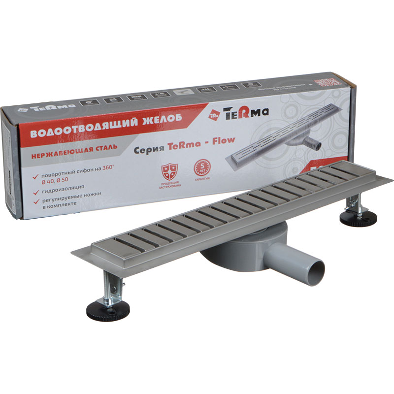 Водоотводящий желоб TeRma Flow 70*600мм, решетка Роуд, применяется для построения безбарьерных душевых и монитруется в стяжку. Конструктивно представляет собой систему из водоотводящего желоба прямоугольной формы, пластикового сифона на 360 градусов и декоративной решетки. Материал решетки - высококачественная нержавеющая сталь, длина дренажного канала 500 мм, регулировка по высоте 65-80 мм, скорость стока воды 30 литров в минуту. Диаметр отверстия выхода в канализацию 40/50 мм.