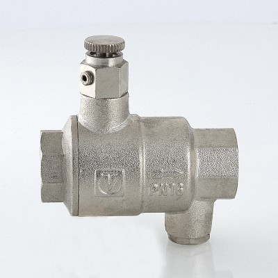(VT.171.N) Обратный клапан с дренажем и воздухоотводчиком – комбинированное устройство с функциями защиты от обратного движения рабочей среды, слива воды после клапана, удаления воздушных пробок при вертикальной установке арматуры. Ручной воздухоотводчик и дренажная пробка (входят в комплект) вкручиваются в патрубки с внутренней резьбой диаметром 1/4". При горизонтальном монтаже клапана воздухоотводчик не требуется, вместо него можно установить манометр. Материал корпуса изделия – латунь CW617N с никелевым гальванопокрытием, штока, тарелки золотника – ABS-пластик, золотникового уплотнения – EPDM, пружины – нержавеющая сталь марки AISI 316. Устройство рассчитано на эксплуатацию при температуре рабочей среды от –20 до +90 °С. Минимальный перепад давлений открытия – 0,025, закрытия – 0,05 бара.