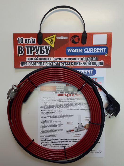 Греющий кабель саморегулирующийся предназначен для обогрева внутри трубы с питьевой водой мощностью 10Вт пог.метр при температуре 5 °C