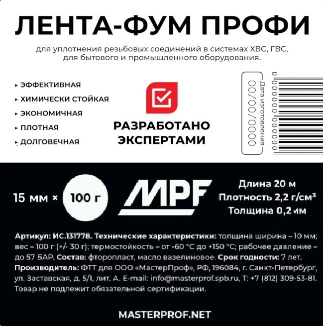 Лента ФУМ фторопластовая MPF-PROFESSIONAL 0,1ммх15мм х2,2кг/м3х20метров (100 гр)