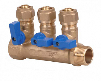 Коллектор прямой с шар.кранами, латунь, 3/4", 3 выхода евроц. 16, синяя ручка