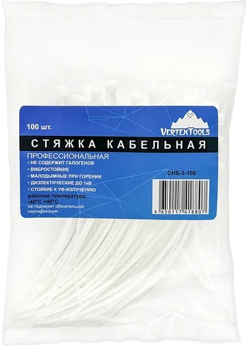 Стяжки кабельные нейлоновые 3x100 белые (100шт.) vertextools СНБ-3-100