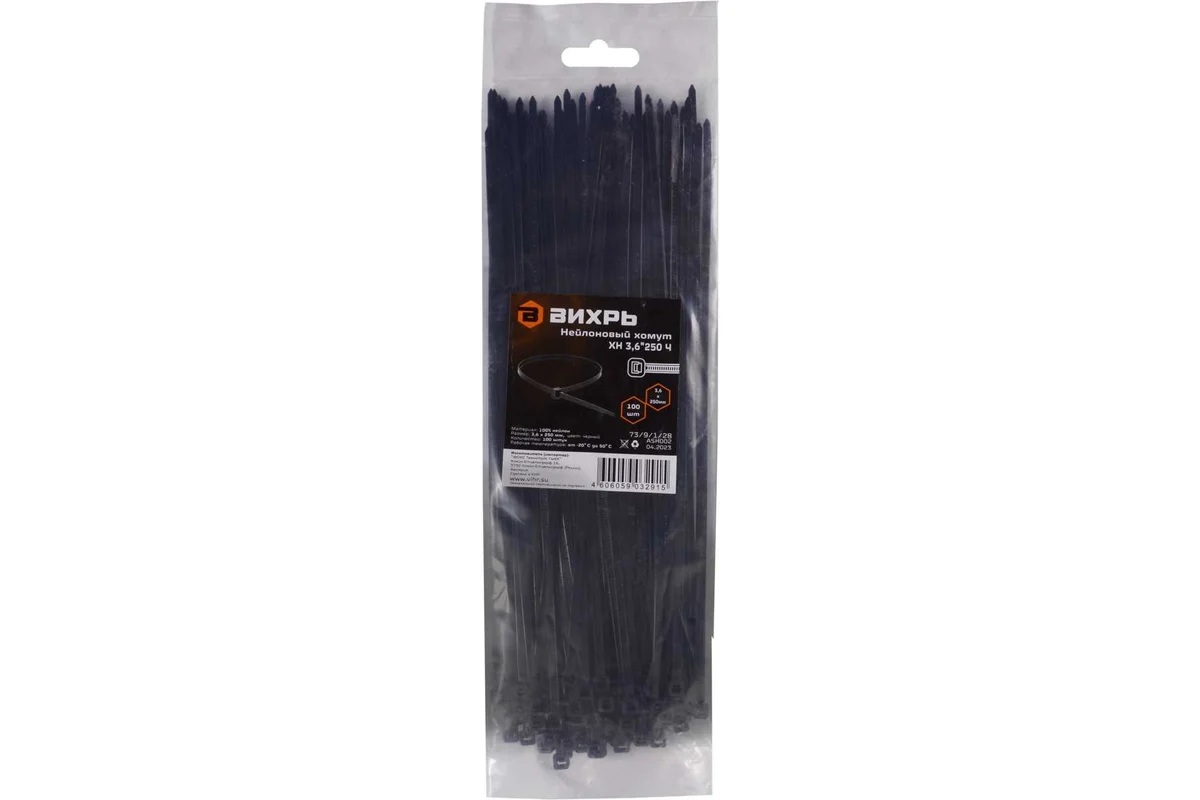 Хомут нейлоновый 3,6x250 черный (100шт.) ВИХРЬ